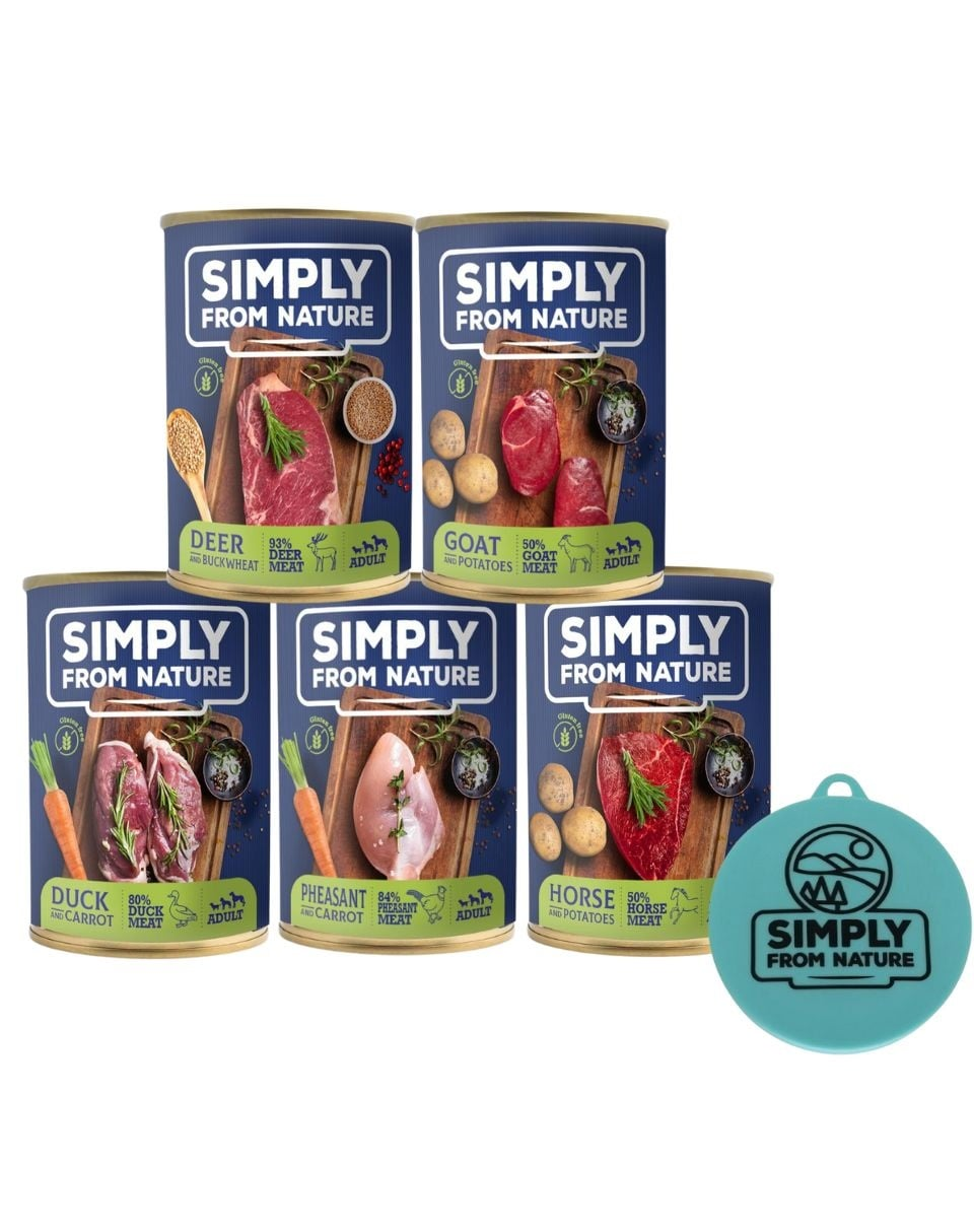 A kiegyensúlyozott receptúra alapja a hús és belsőségek, zöldségekkel, gyümölcsökkel együtt. A gabonafélék hiánya nem terheli meg a kutya emésztőrendszerét. Az egész kíméletes és jól emészthető. A kiváló minőségű, természetes alapanyagok ízletes és tápláló eledelt alkotnak. A Simply from Nature nedves eledel alacsony hőkezelésének köszönhetően még a kényes kutyák is szeretni fogják, ráadásul maximális tápértéket őriz meg!