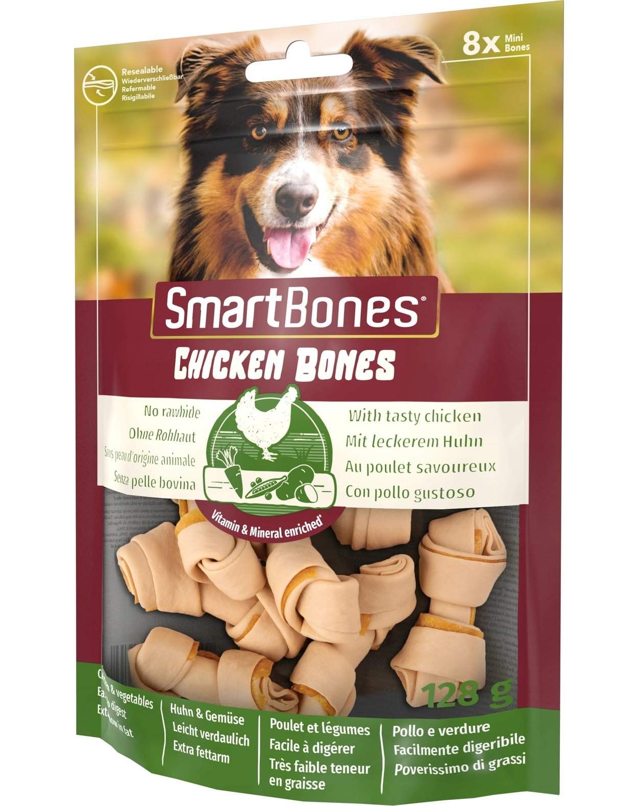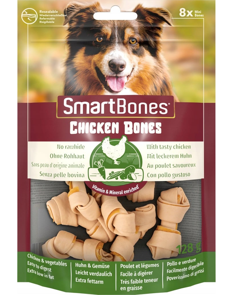 Az ízletes SmartBones® bőr nélküli csirkével (nyersbőr nélkül) két rétegből áll, egy belső réteg finom csirkéből és egy külső réteg zöldségből. Ezek a kistestű kutyáknak szánt mini rágócsontok könnyen emészthetőek és nagyon alacsony zsírtartalmúak (0,5%).