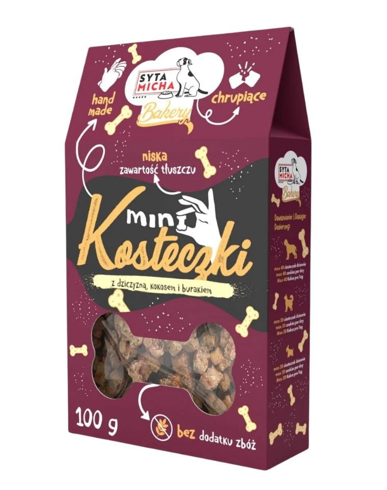A SYTA MICHA Mini falatok kézzel készített, ropogós kutyakekszek, kizárólag természetes összetevőkkel. Apró méretük miatt tökéletesek tréninghez, jutalmazáshoz vagy akár napi nassolnivalóként is. Hipoallergén receptúrájuk vaddisznóhúsra, MCT zsírsavakban gazdag kókuszra és céklára (természetes FOS-forrás) épül, támogatva kutyája emésztését és immunrendszerét.