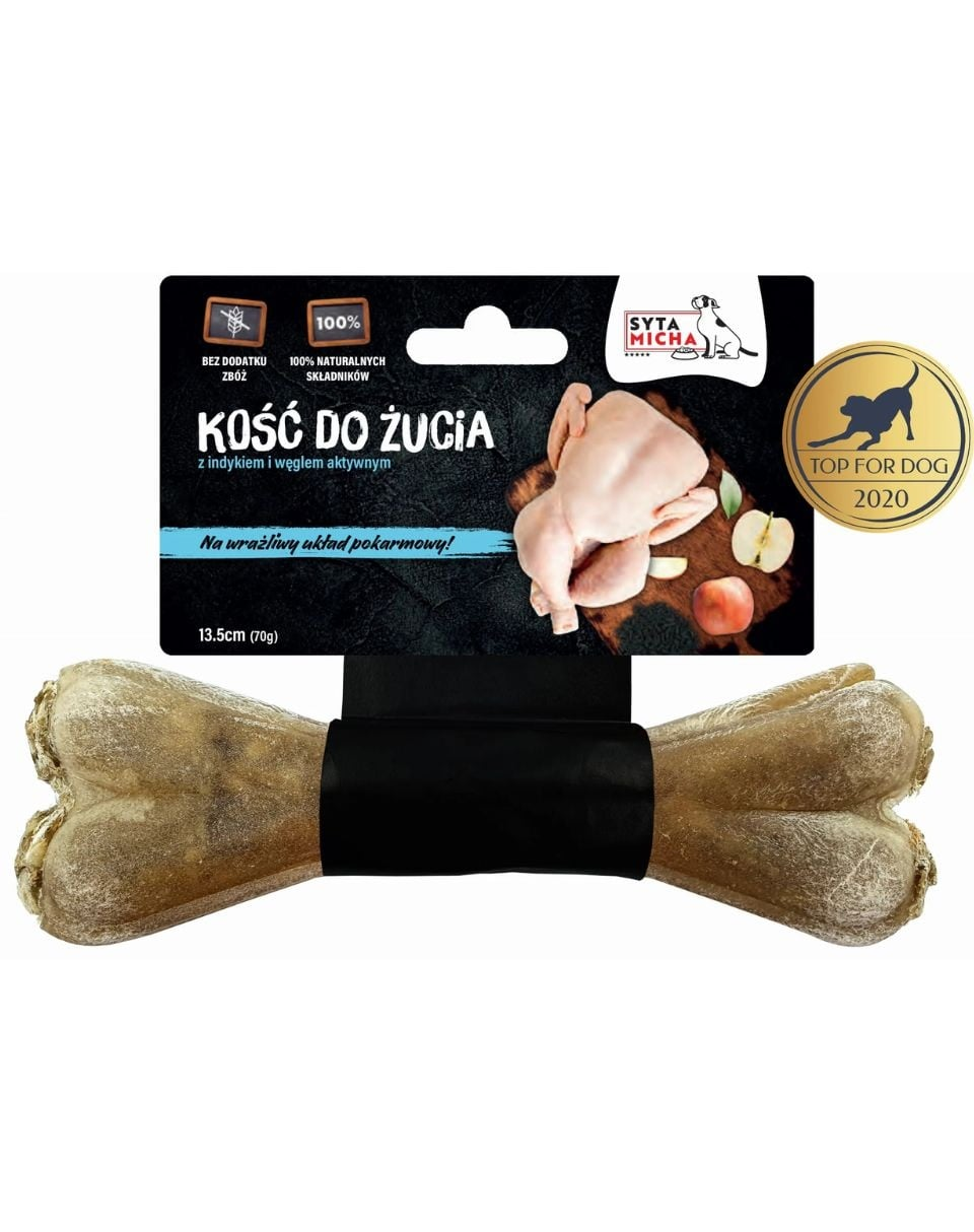 A funkcionális töltelék, amely MOS és FOS prebiotikumokkal, almával és aktív szénnel gazdagított, támogatja a bélflórát és segít enyhíteni az emésztési problémákat. A csont 100%-ban természetes összetevőkből készült: marhahús bőrből, pulykahúsból és növényi adalékokból. Alacsony hőmérsékleten szárítva, így megőrzi tápértékét. A bőrben található kollagén természetes kötőanyagot képez.