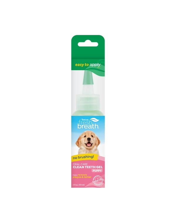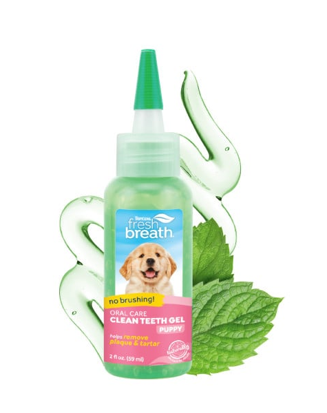 TRÓPICLEAN - Egészítse ki kiskutyája szájápolási rutinját más Fresh Breath termékekkel, mint például kölyökvíz adalékkal, fogkefe és fogmosó gél készlettel és kölyök leheletfrissítő jutalomfalatokkal.