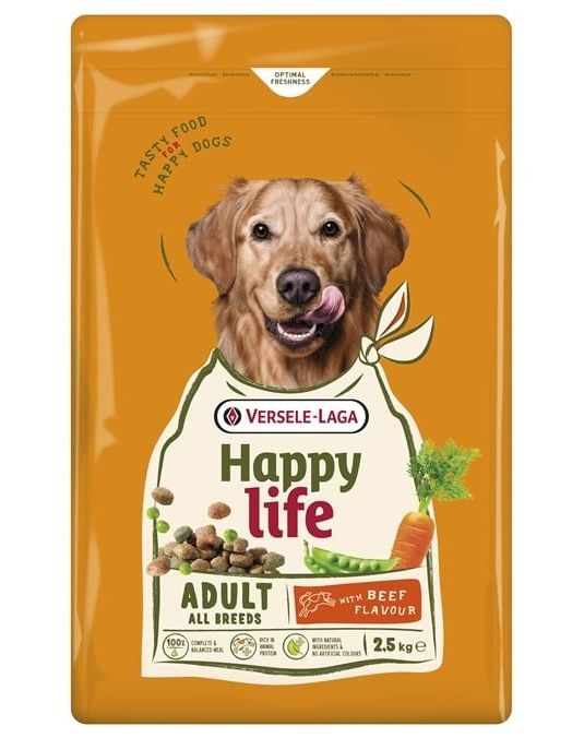 Kutyatáp Happy Life Adult with Beef Flavour egy különösen ízletes tápanyagok kombinációja, amelyet felnőtt kutyák számára fejlesztettek ki, akik imádják a marhahús aromáját. Teljes vitamin-, ásványi anyag- és fehérje-készletet tartalmaz, amely támogatja az immunitást, a csontok és izmok egészségét, valamint a megfelelő testsúly fenntartását.