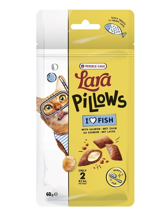 Lara Snack Pillows with Salmon Happy Fur ízletes, ropogós párnácskák aromás lazaccal, kifejezetten azoknak a macskáknak készültek, akiknek a szőre különleges belső ápolást érdemel. A biotin, cink, sörélesztő és a természetes omega-3 zsírsavforrásként szolgáló krill tartalmának köszönhetően a jutalom támogatja az egészséges bőrt és fényt ad a szőrnek.