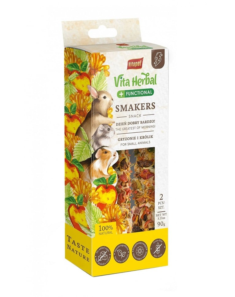 A VITAPOL Vita Herbal Functional Smakers Good Morning Very ideális választás azon rágcsáló- és nyúltulajdonosok számára, akik egészséges és változatos étrendet szeretnének biztosítani kedvenceiknek. A termék természetes összetevőkben gazdag, amelyek támogatják kedvence általános állapotát és egészségét. A Smakers Good Morning rendszeres használatának köszönhetően kedvence tele lesz energiával és készen áll a mindennapi kihívásokra. A kényelmes csomagolás hosszabb ideig frissen tartja a terméket, így kiváló választás minden gondoskodó gazdi számára.