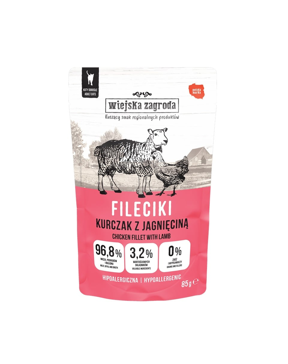 Természetes, szaftos filézett falatok macskádnak! A Wiejska Zagroda filézett csirke- és báránydarabokat tartalmazó táp kiváló választás, ha macskád számára magas minőségű, természetes, hipoallergén, gabonamentes nedves eledelt keresel. A 96,8%-os hús-, belsőség- és húsleves tartalomnak köszönhetően még a legválogatósabb és legérzékenyebb macskák számára is ideális.