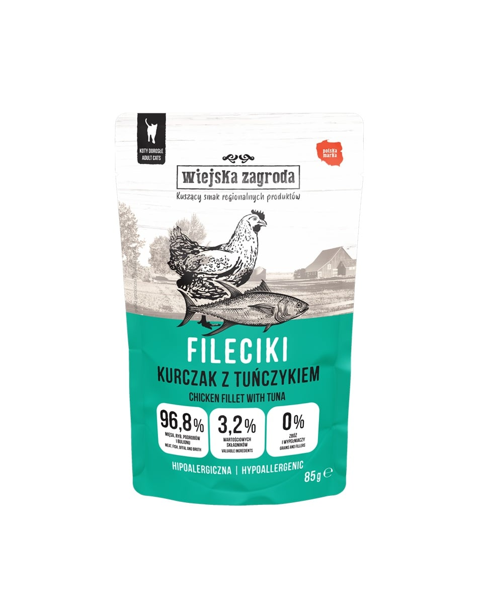A Wiejska Zagroda csirkés és tonhalas nedves eledel finom filézett darabjainak és kényelmes 85 g-os kiszerelésének köszönhetően ideális a válogatós, érzékeny emésztésű, vagy a minőségre érzékeny macskák mindennapi eledelének.