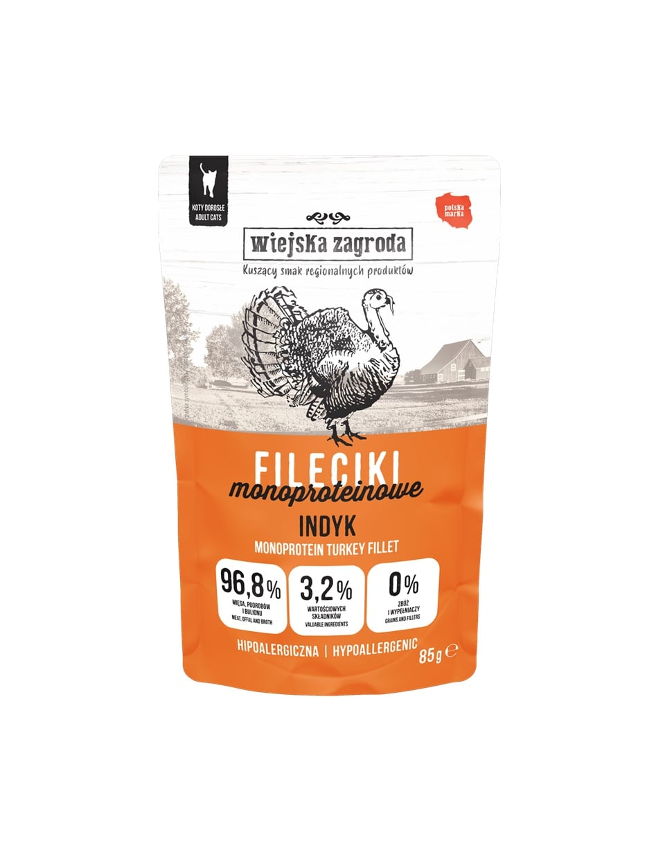 Kiváló választás, ha természetes, szaftos filézett húsformát keresel macskádnak! A Wiejska Zagroda monoprotein pulykafilézett húsai 96,8%-os hús-, belsőség- és húsleves tartalommal, gabonamentes, hipoallergén receptúrával készülnek – még az érzékeny emésztésű vagy válogatós macskáknak is ajánlottak.