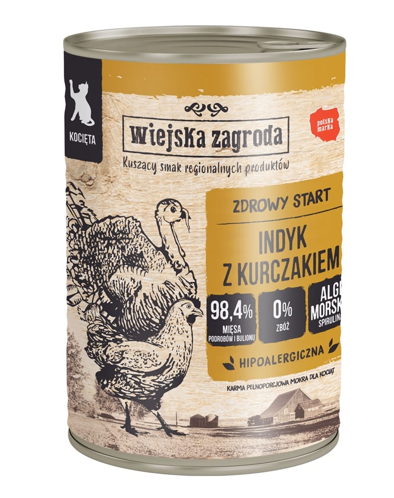 pulyka 35% (ebből kb. 80% izom- és szívhús, kb. 20% máj), csirke 35% (100% izomhús), pulyka- és csirkehúsleves 28,4%, ásványi anyagok 1%, lazacolaj 0,5%, spirulina 0,1%.