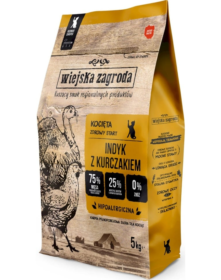 A Wiejska Zagroda egy teljes értékű, hipoallergén táplálék, amelyet növekvő cicák számára fejlesztettek ki. A pulyka és a csirke kombinációja garantálja a magas emészthetőséget és a könnyű felszívódást, miközben biztosítja az izomzat, az idegrendszer és az immunrendszer megfelelő fejlődéséhez szükséges összes tápanyagot.