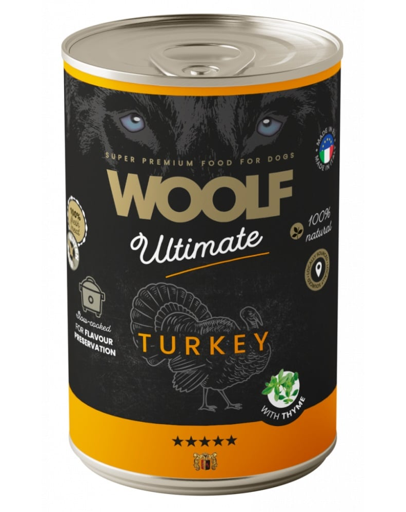 A WOOLF Ultimate Adult Dog Turkey and Thyme egy teljes értékű, gluténmentes nedves táplálék, amelyet minden fajtájú felnőtt kutya számára fejlesztettek ki. Receptje pulykahúsra épül – ez egy könnyen emészthető, alacsony zsírtartalmú fehérjeforrás, amely támogatja a megfelelő kondíció és izomtömeg fenntartását. Az aromás kakukkfű hozzáadása nemcsak gazdagítja az eledel ízét, hanem támogatja az immunitást, valamint antioxidáns és gyulladáscsökkentő tulajdonságokkal rendelkezik. Az összes összetevő helyi beszállítóktól származik, és alacsony hőmérsékleten, lassú főzéssel készül, hogy megőrizze tápértékét és természetes ízét.
